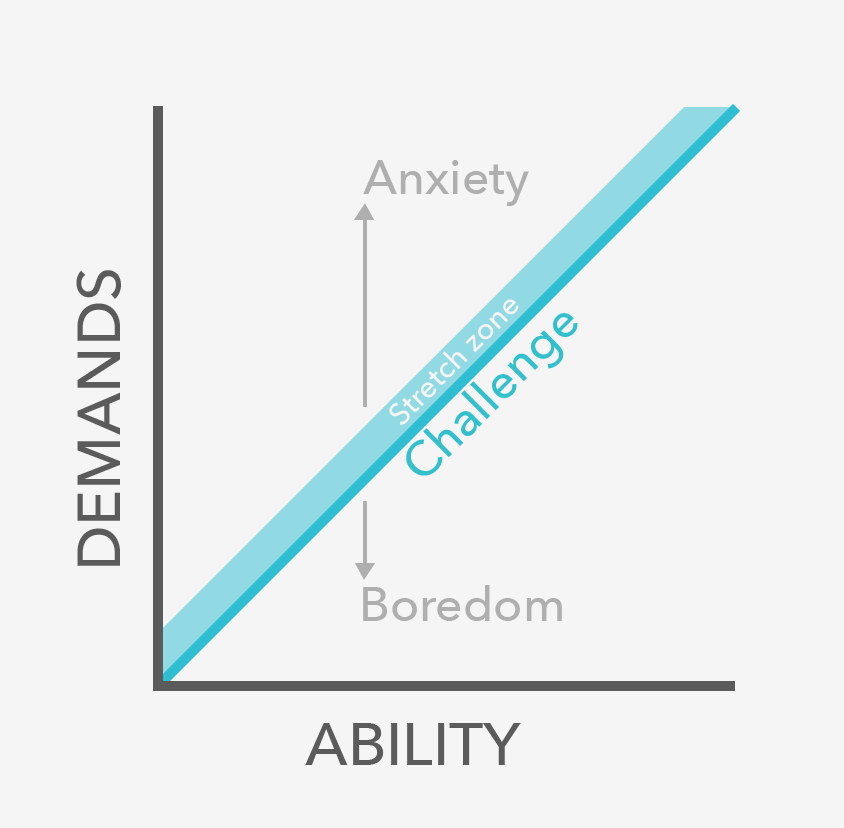 Som grafen over illustrerer: Målet bør være å ha en jobb der det som forventes av deg passer med dine ferdigheter. I stedet for å se etter enkle jobber uten noe stress bør du prøve å finne en arbeidsplass med gode støttefunksjoner og meningsfulle arbeidsoppgaver, og deretter finne muligheter for å utfordre deg selv.